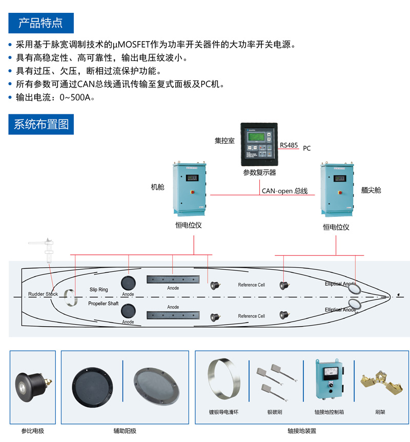 - Product description: 外加电流阴极保护装置是为了使浸没于水中的外部船体免受腐蚀而设计的。本套装置经过精心设计、合适 的安装,能够有效地消除海水对船体、舵和螺旋桨(推进器)的腐蚀。外加电流阴极保护装置可以大量减少牺 牲阳极的数量,降低维护成本和坞修工作量。
